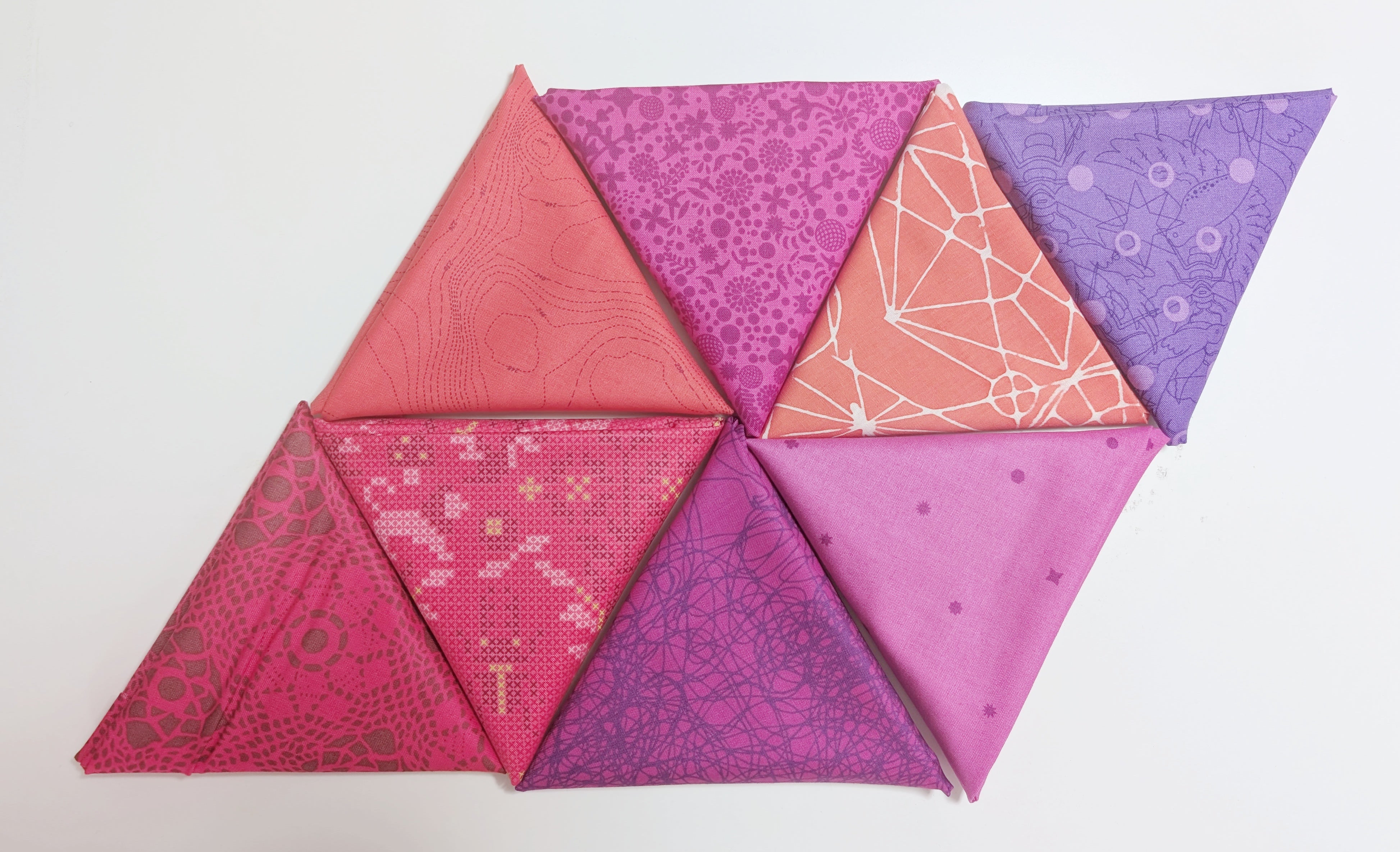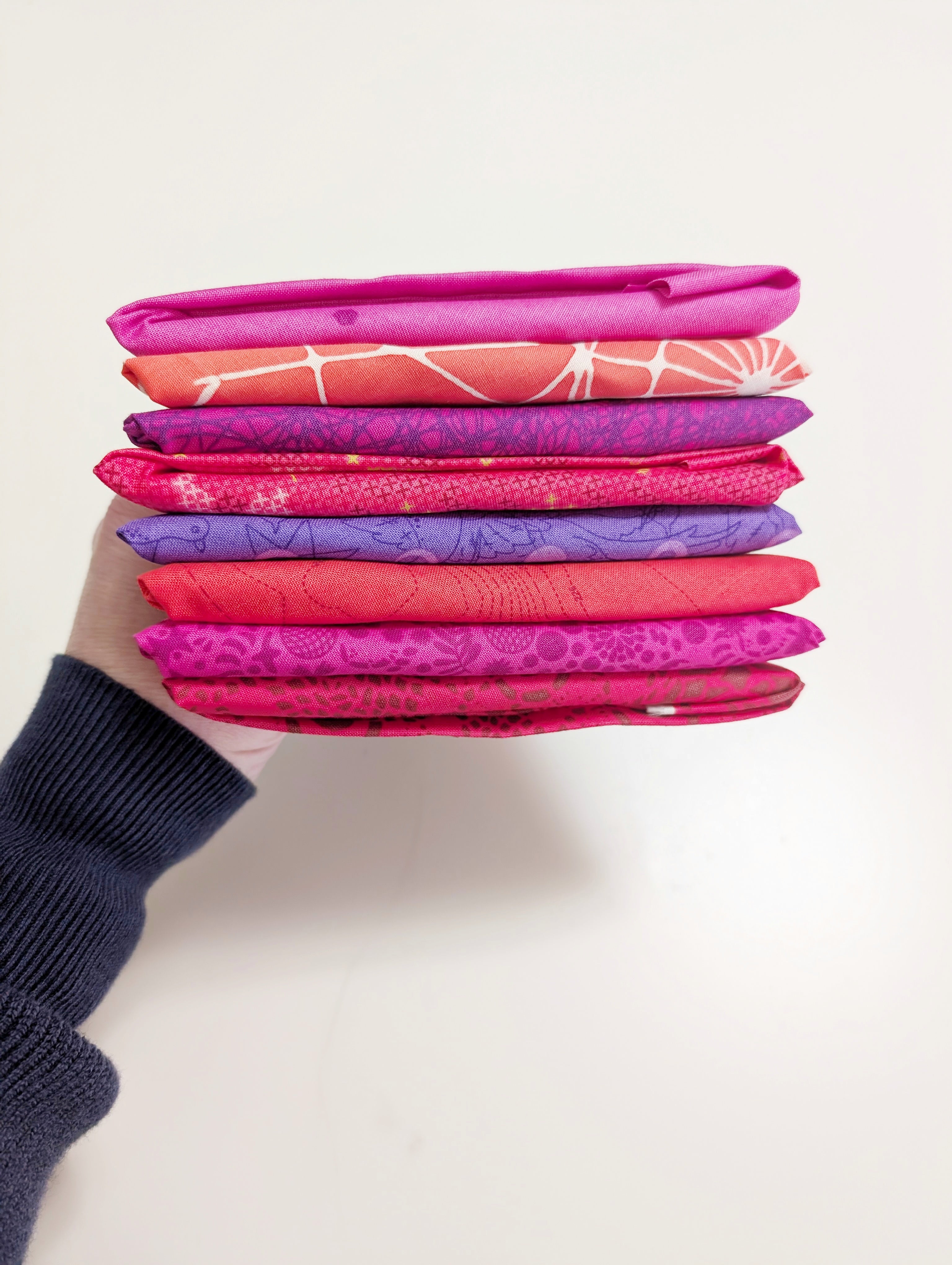 Each bundle includes eight coordinating fat quarters made from designer-quality quilting cottons. Every set is hand-curated, so each bundle is unique while still working beautifully together as a cohesive color story.